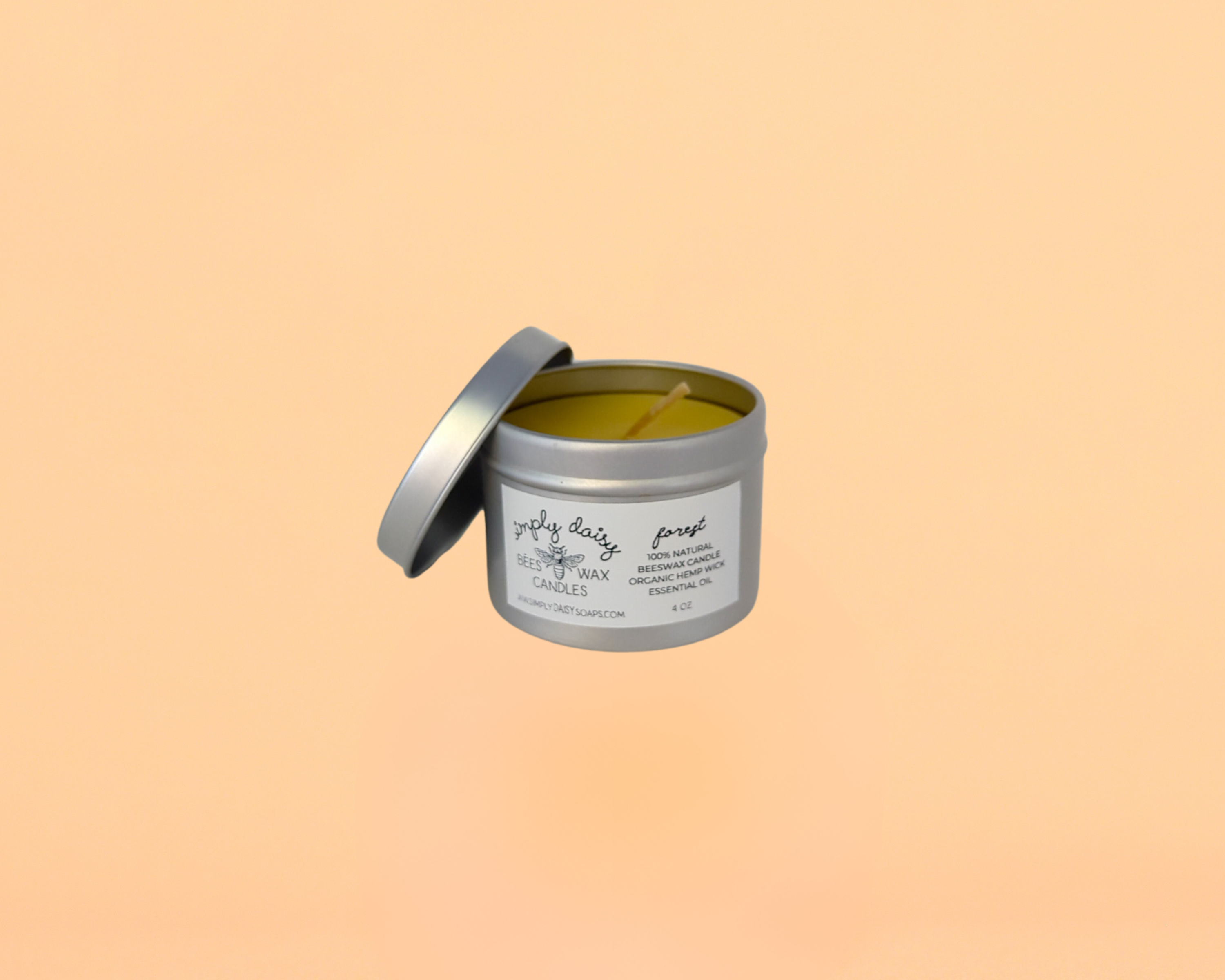 Our beeswax candles come in a 4 oz aluminum tin and are lightly scented with essential oils and certified natural fragrances.