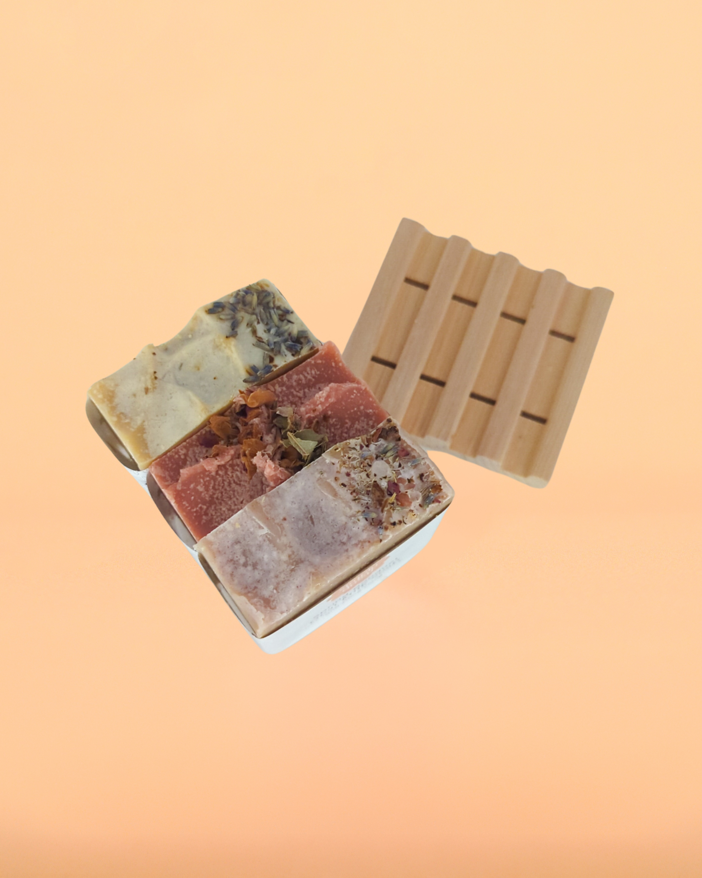 Bring the garden to your sink. This sweet set includes three of our best-loved floral goat milk soaps: calming Lavender, romantic Rose, and fresh Spring Bouquet. Each bar is made with creamy goat milk and nourishing oils for a gentle, skin-loving lather. The included wooden soap dish helps your bars dry between uses, so they last longer and stay beautiful. A perfect gift—or a treat for yourself.