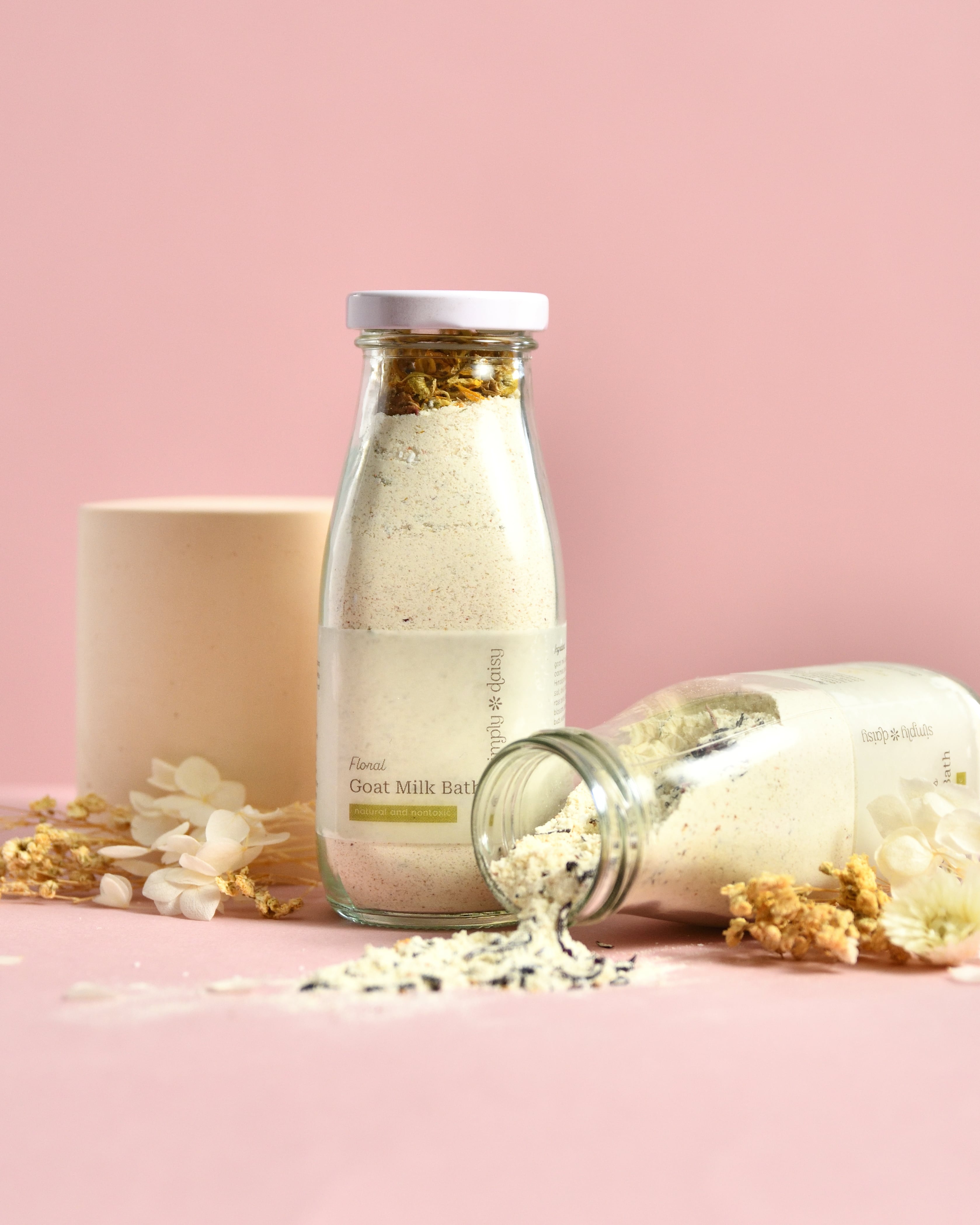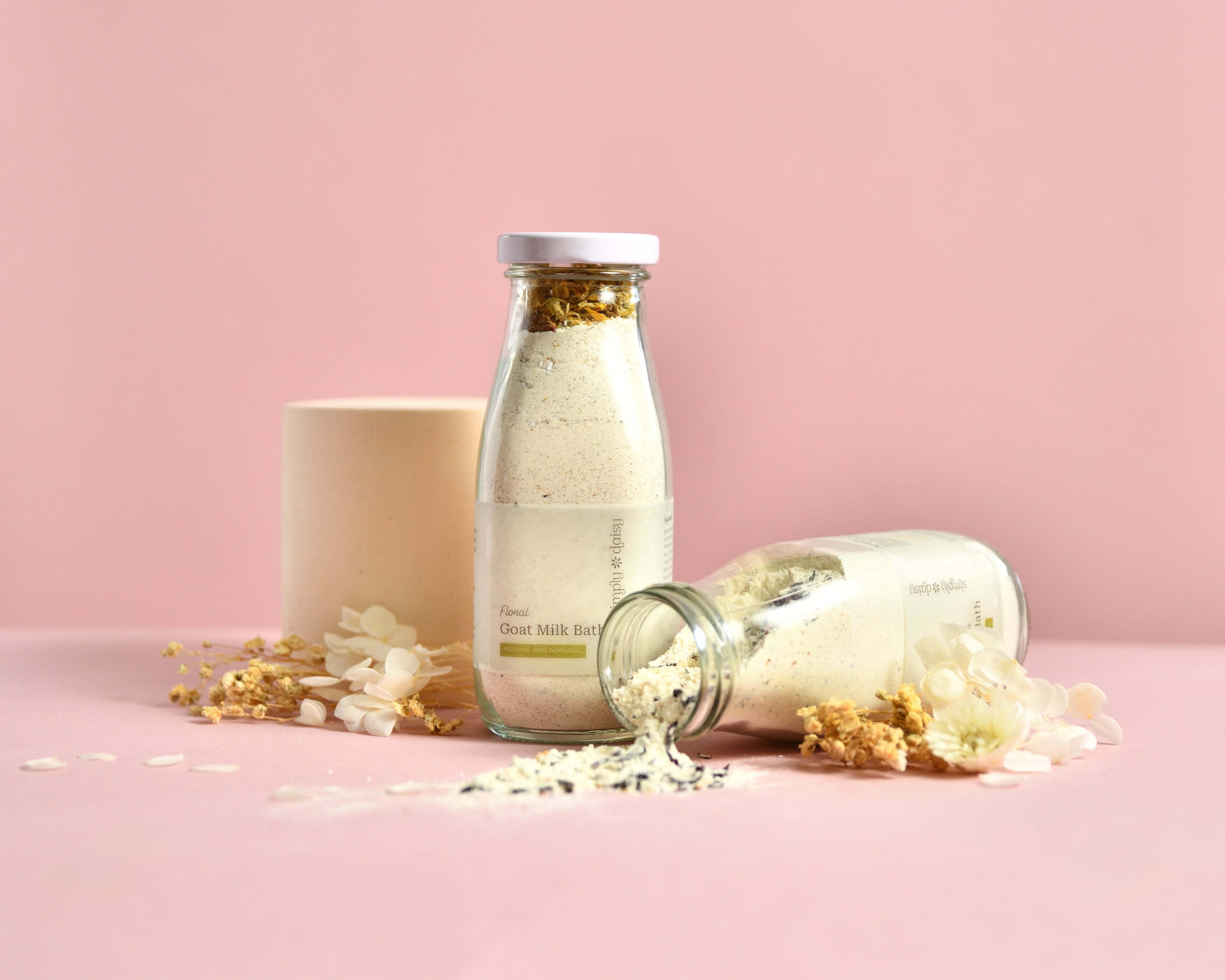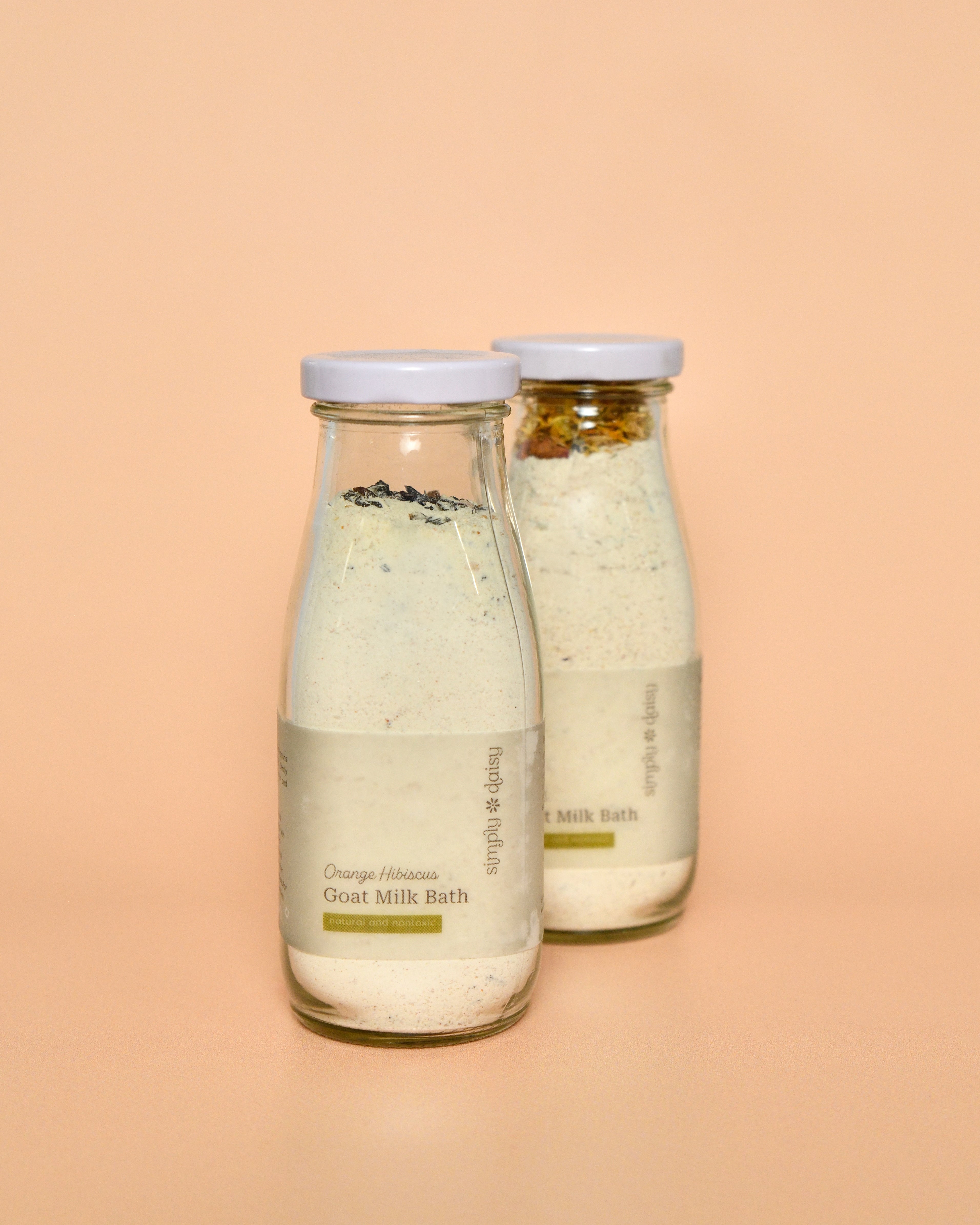 Fresh raw goat milk, sodium hydroxide, organic extra virgin olive oil, organic extra virgin coconut oil, raw shea butter, essential oils, natural colors, and botanicals