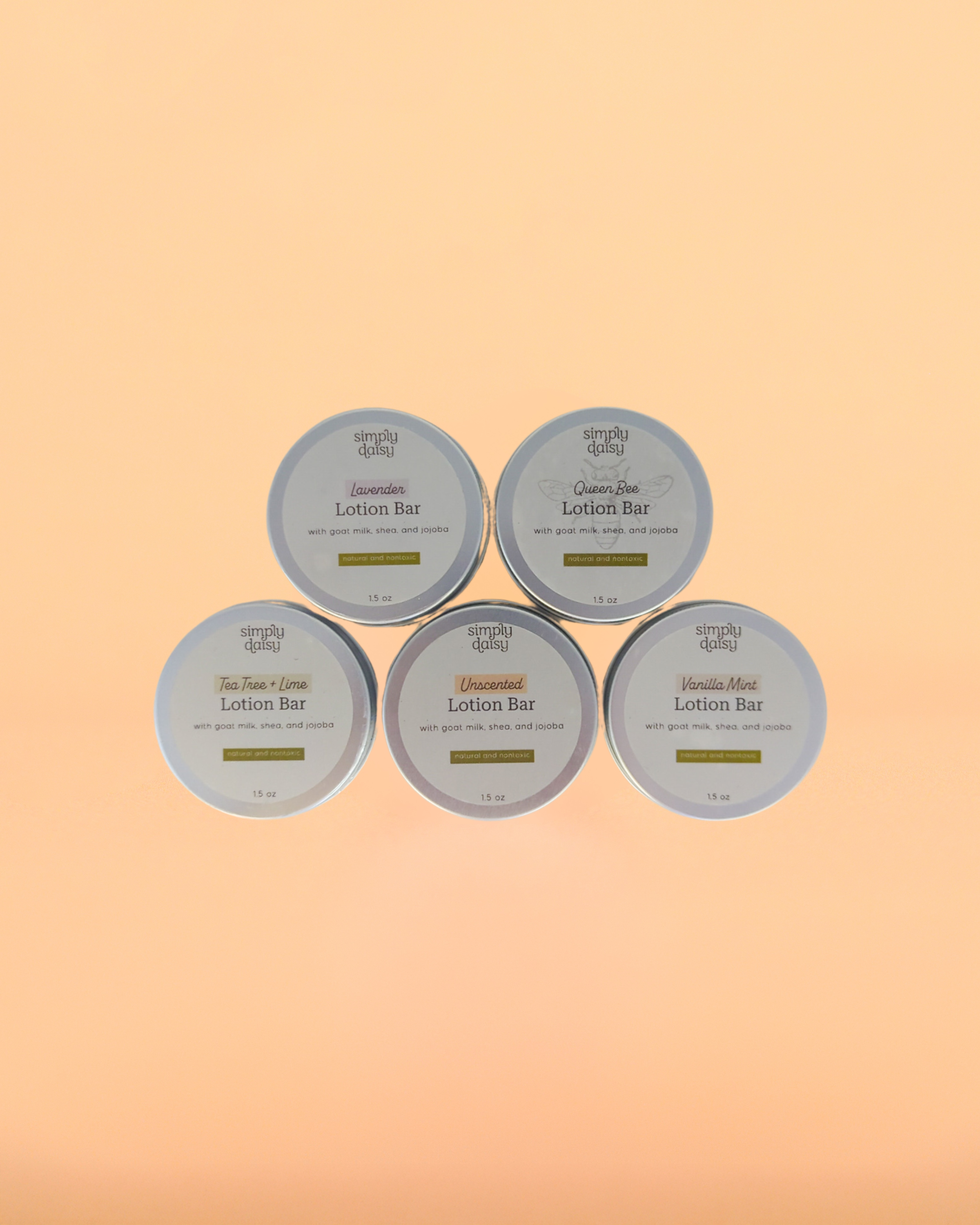 Soft skin, the simple way. This full set of our bestselling goat milk lotion bars includes all five lovely scents: calming Lavender, sweet Queen Bee, fresh Tea Tree + Lime, gentle Unscented, and cool Vanilla Mint. Made with creamy goat milk, rich butters, and nourishing oils, each bar melts right into dry skin to hydrate, soothe, and protect—without the mess of liquid lotion. Just real, simple care for hands, feet, elbows, and everywhere in between.