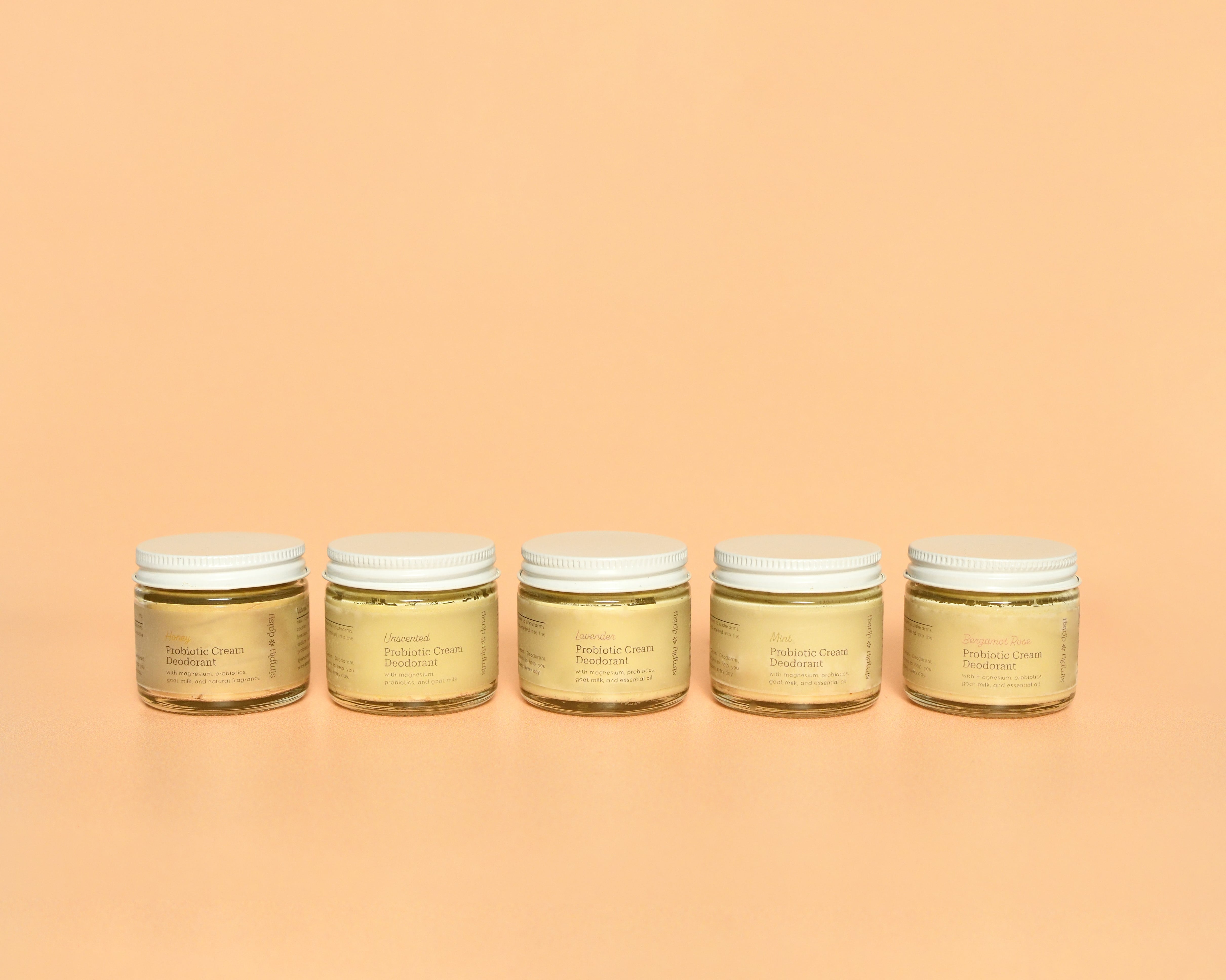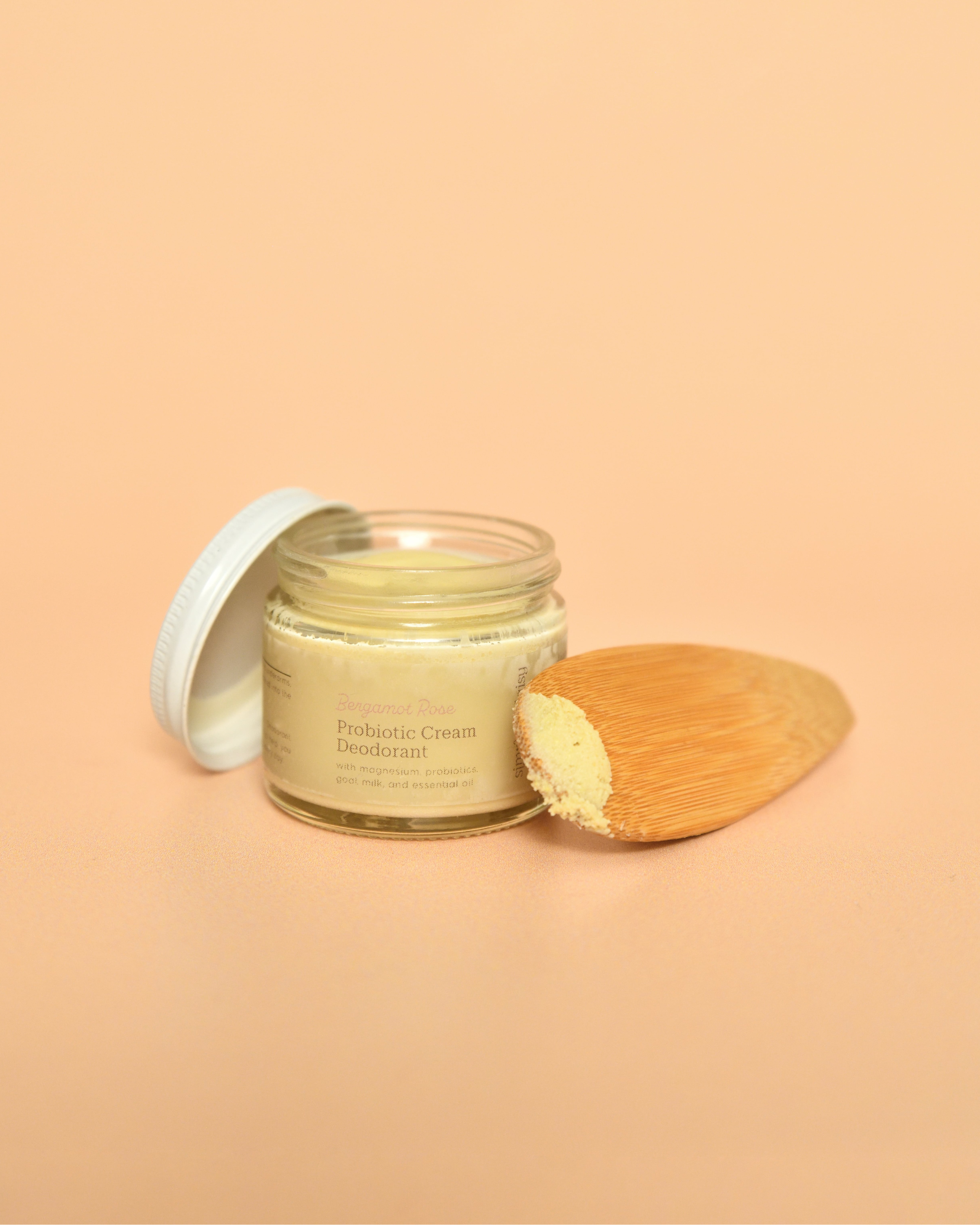 Our Probiotic Cream Deodorant is a gentle yet powerful formula that keeps you feeling fresh without the harsh chemicals. Made with raw kokum butter, organic extra virgin coconut oil, and soothing goat milk, it’s rich, nourishing, and easy on sensitive skin. Magnesium hydroxide and a little bit of baking soda help neutralize odor, while kaolin clay and arrowroot absorb moisture. Added probiotics support your skin’s natural microbiome for a balanced, healthy underarm environment.