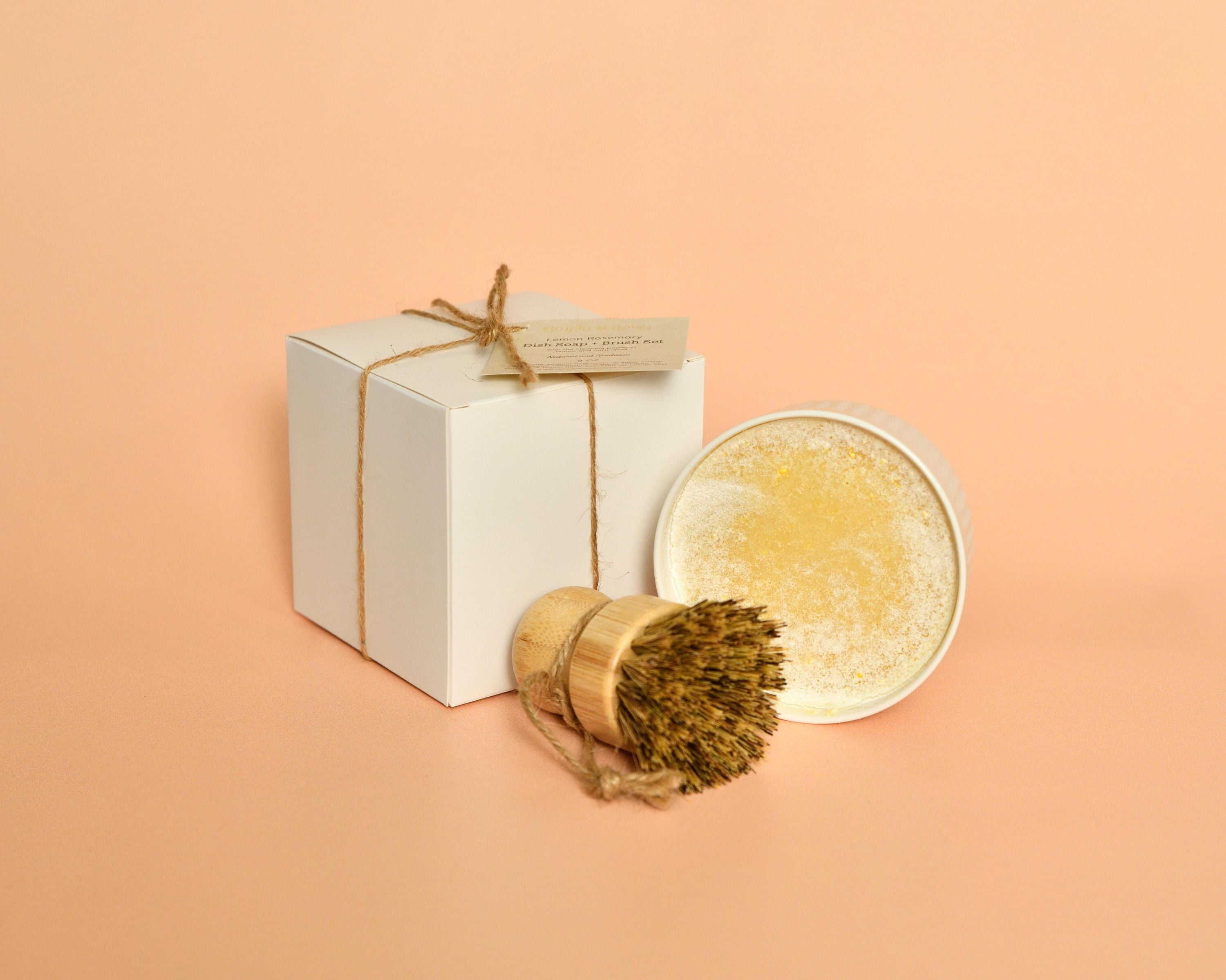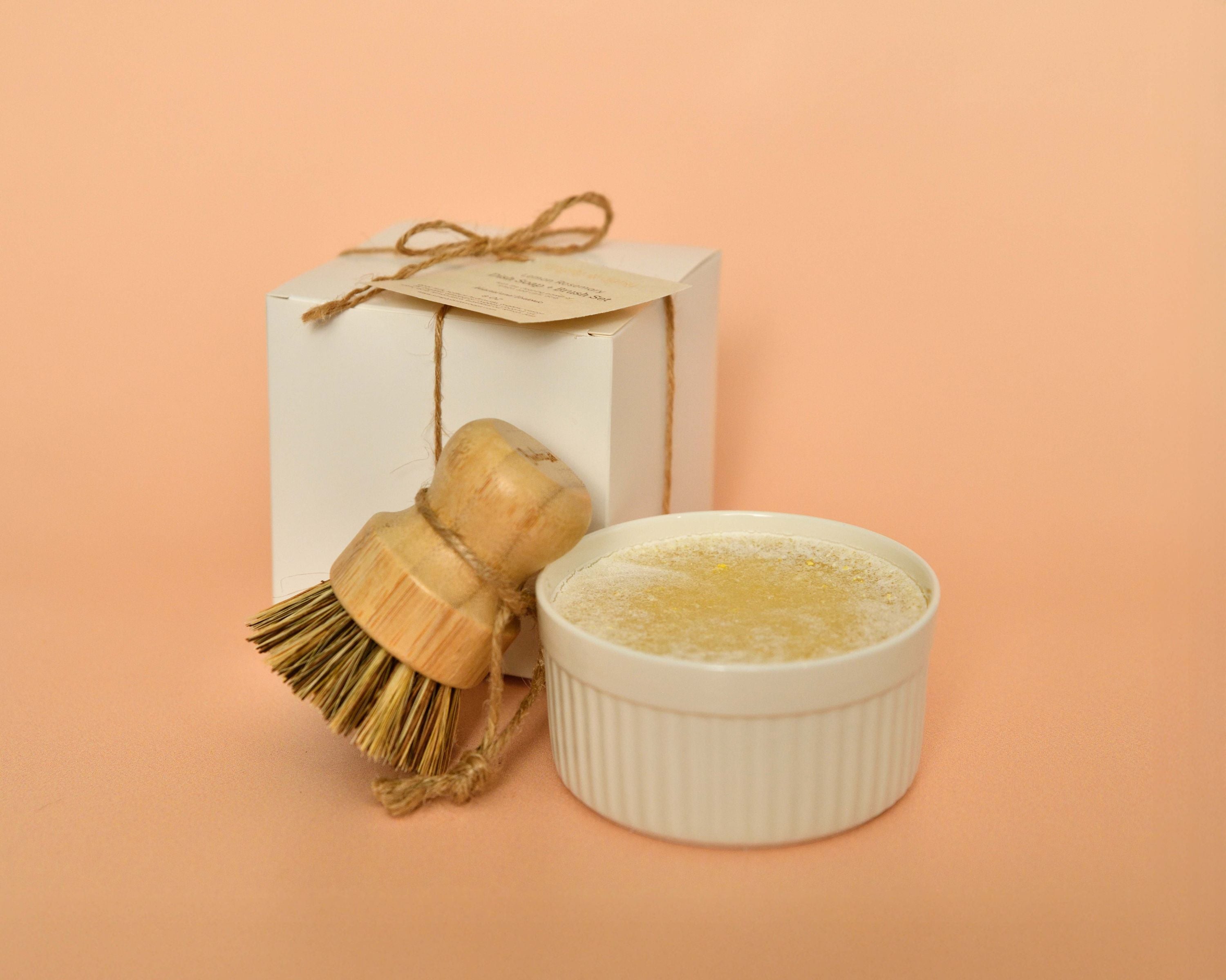 Everything you need for a clean, low-waste kitchen. This thoughtful set includes our handcrafted Solid Dish Soap—made with goat milk, citric acid, and bright lemon or lime—and your choice of our natural bamboo dish brushes.