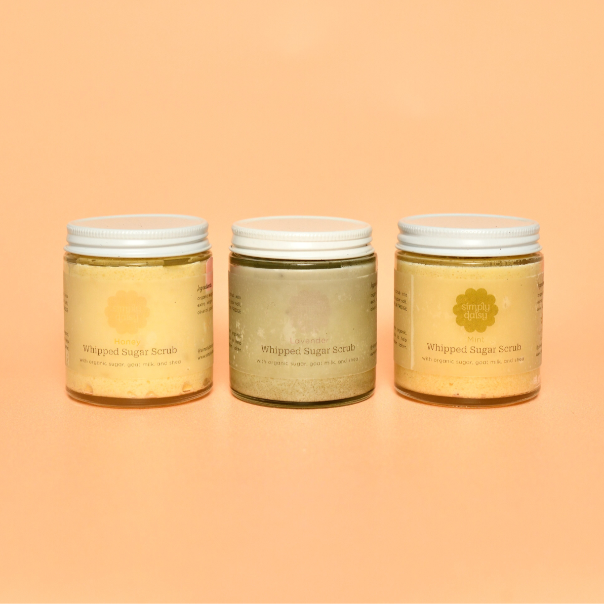 Our Whipped Sugar Scrub is a creamy blend of exfoliation and moisture in one dreamy jar. Made with organic sugar to gently buff away dry skin, it’s whipped with raw shea butter, extra virgin coconut and olive oils, and fresh goat milk to leave your skin feeling soft, smooth, and deeply hydrated. Essential oils add a light, natural scent, while vitamin E and natural plant-based colors keep things simple and skin-friendly.